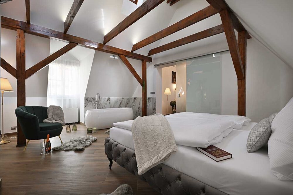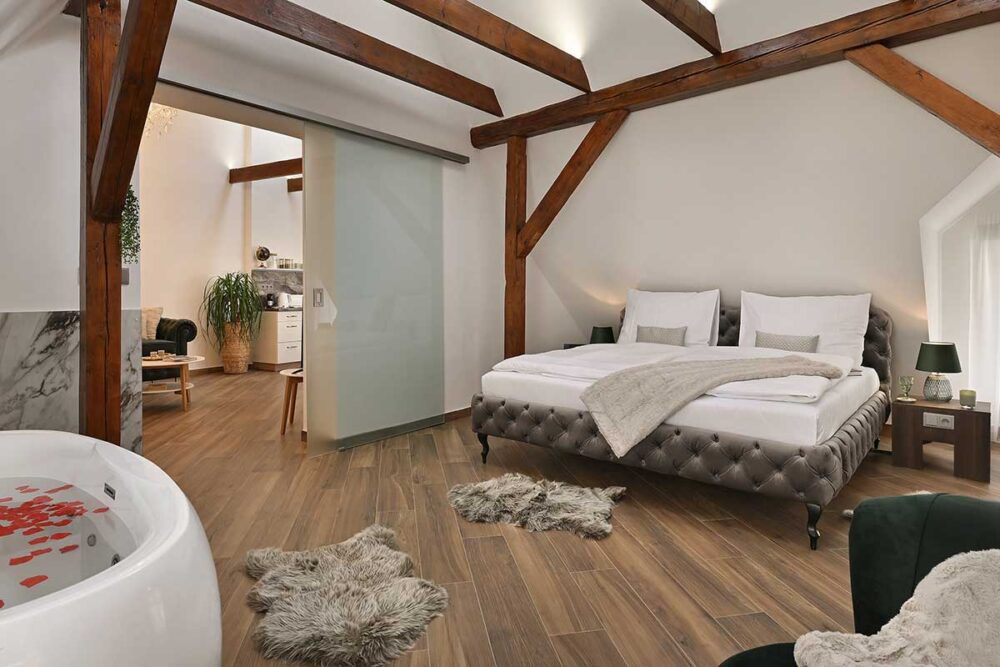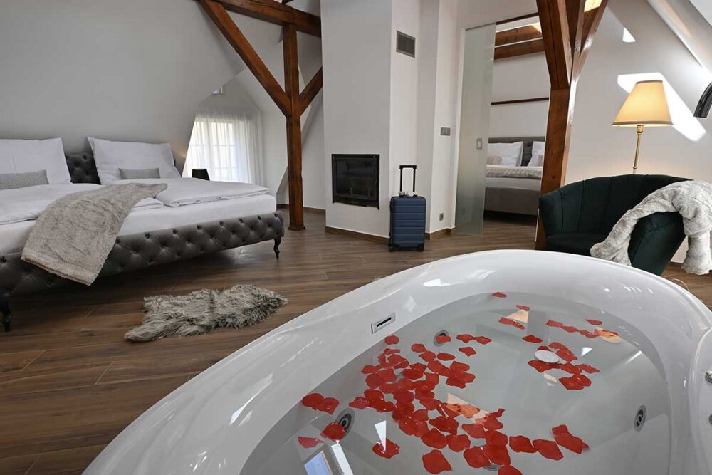 En-suite bathroom with modern fixtures, Jacuzzi and complimentary toiletries