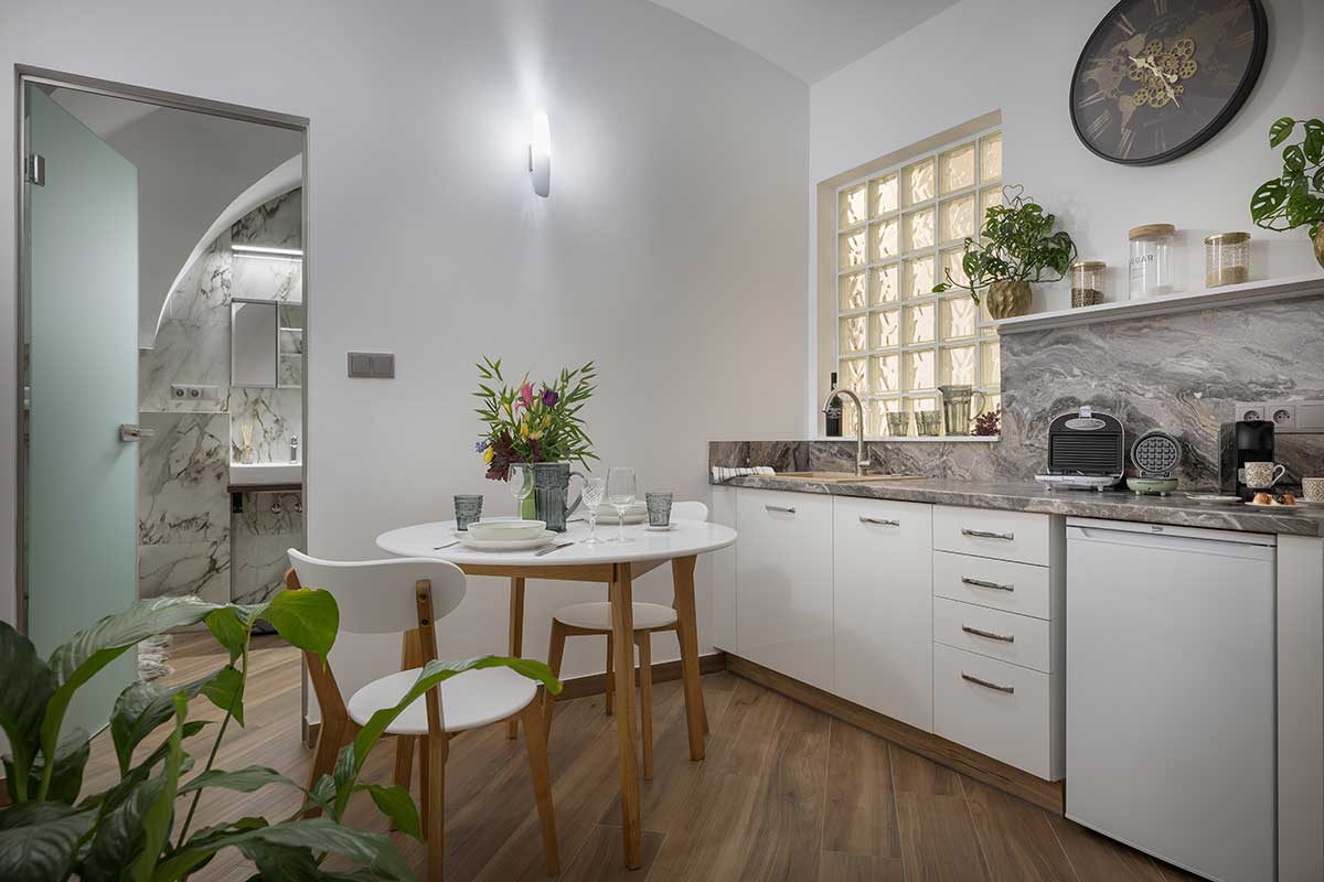 - Voll ausgestattete Kochnische mit Espressomaschine und gemütlicher Essecke